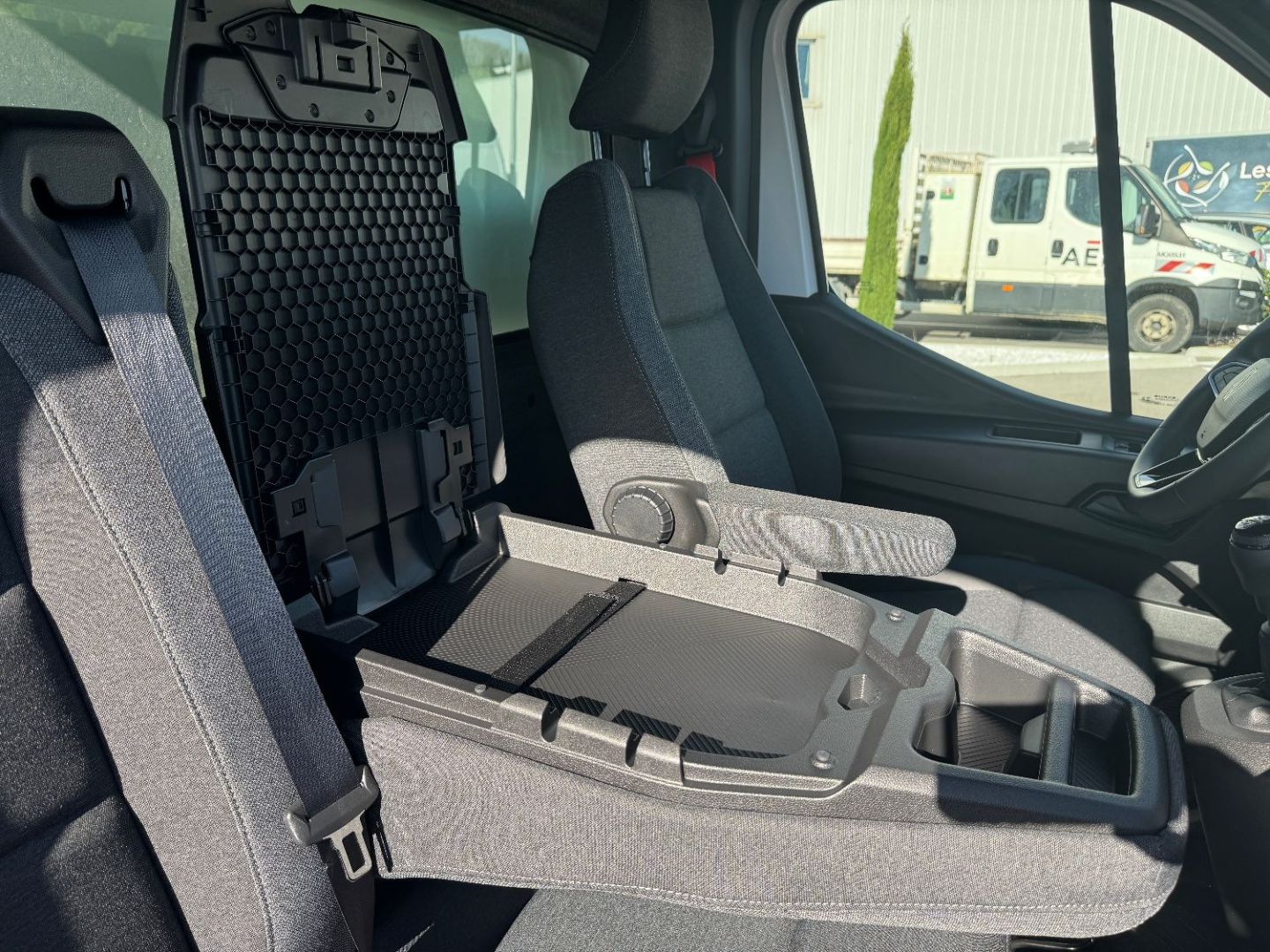 Banquette passager avec rangement et bureau mobile