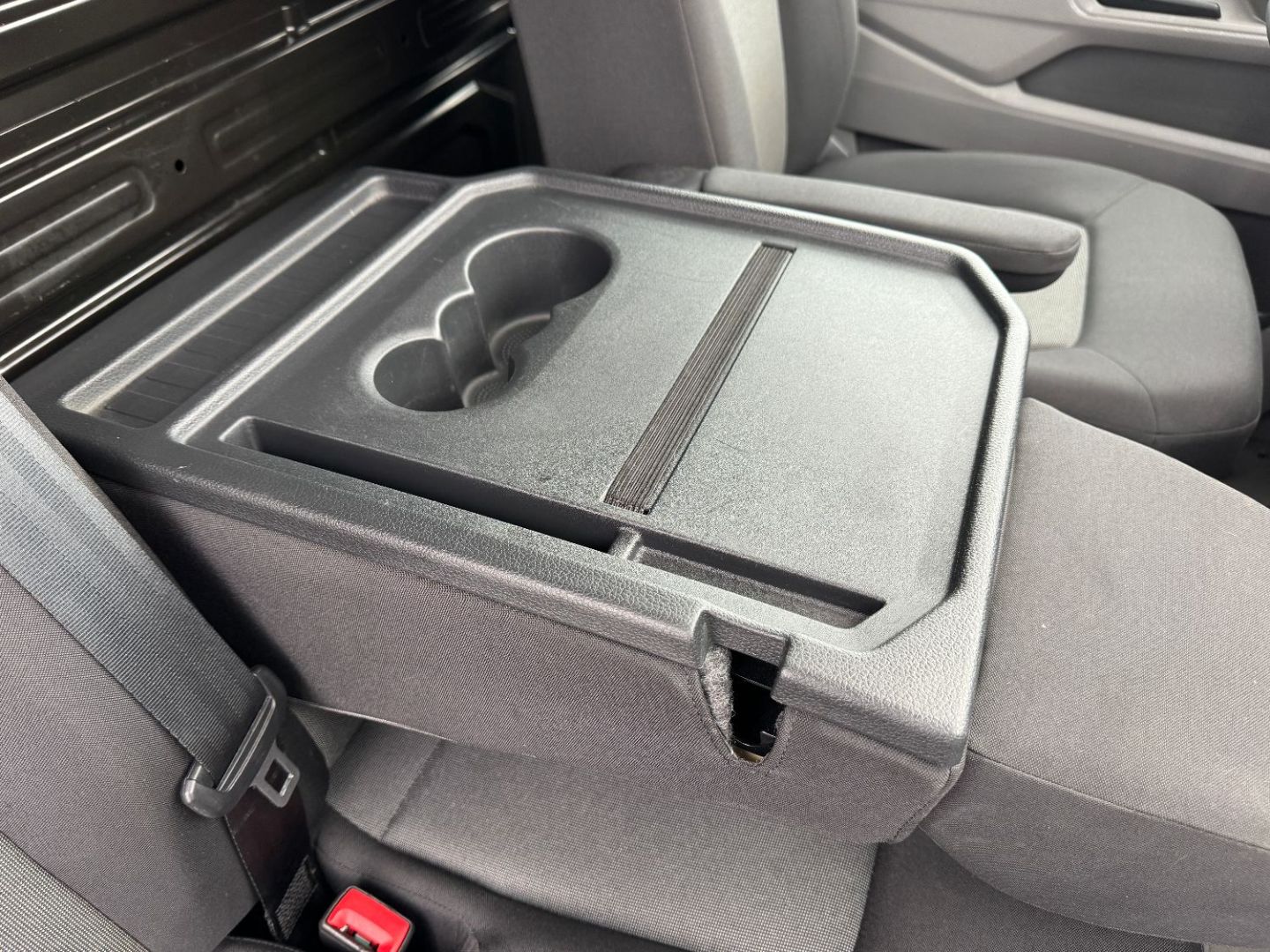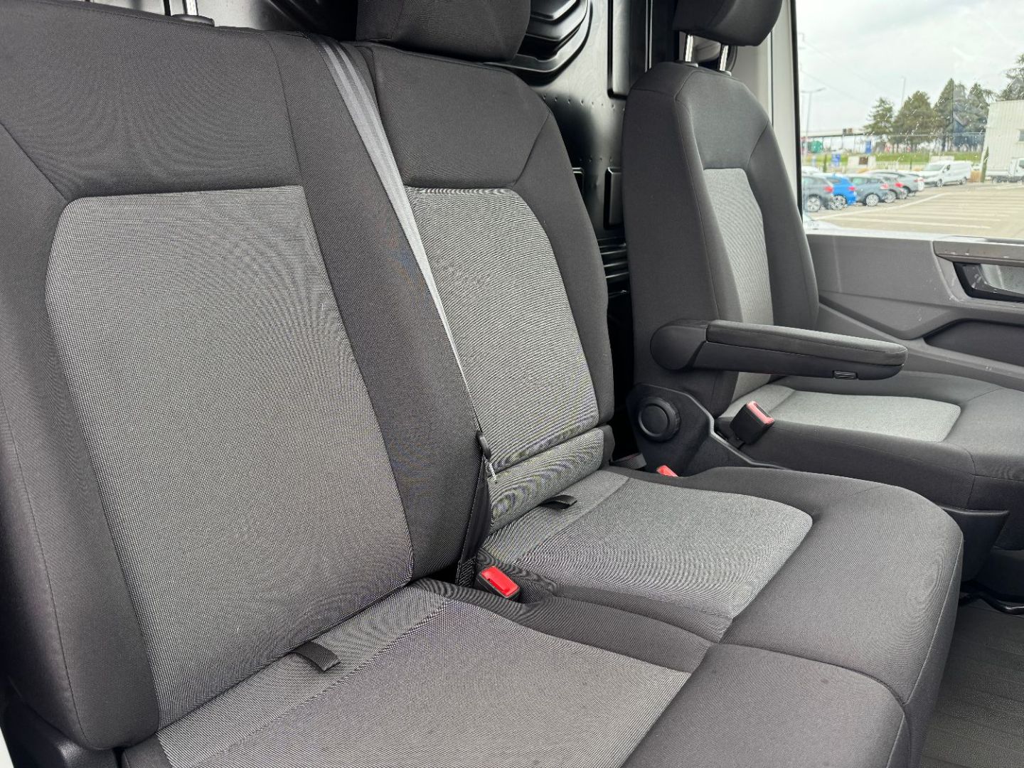 Banquette double pour 2 passagers avec grand espace de rangement sous les assises relevables separement, d'une table au dos de la place du milieu (rabattable) avec porte-gobelet et porte-stylo